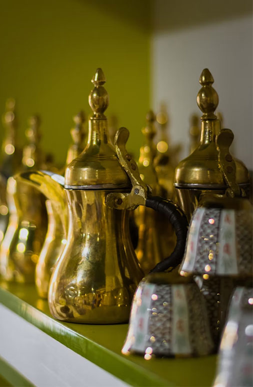 Τα εκθέματα καλύπτουν μια μακρά περίοδο διάδοσης κι εξέλιξης του καφέ, με έμφαση στον Ισλαμικό κόσμο. Τα σκεύη παρασκευής του καφέ αποτελούν από μόνα τους μια ιδιαίτερα αξιόλογη συλλογή, η οποία περιλαμβάνει παραδοσιακά τούρκικα Ibrik (μπρίκια) με μακρύ χερούλι, περίτεχνα ποτηράκια και κεραμικά από την Ανατολή αλλά και πολλά Dallah, τις εμβληματικές καφετιέρες των Αράβων, που έχουν γίνει πλέον αναπόσπαστο κομμάτι της πολιτιστικής τους ταυτότητας. Η μεγάλη τους ποικιλία (από φτωχικά πήλινα ως περίτεχνα χάλκινα και χρυσοποίκιλτα, προορισμένα για πρίγκιπες και βασιλιάδες) είναι ενδεικτική της τεράστιας, γεωγραφικά και κοινωνικά, διάδοσης του καφέ σε ολόκληρο τον Ισλαμικό κόσμο, προτού φτάσει στην Ευρώπη μέσω των εμπορικών δρόμων.
