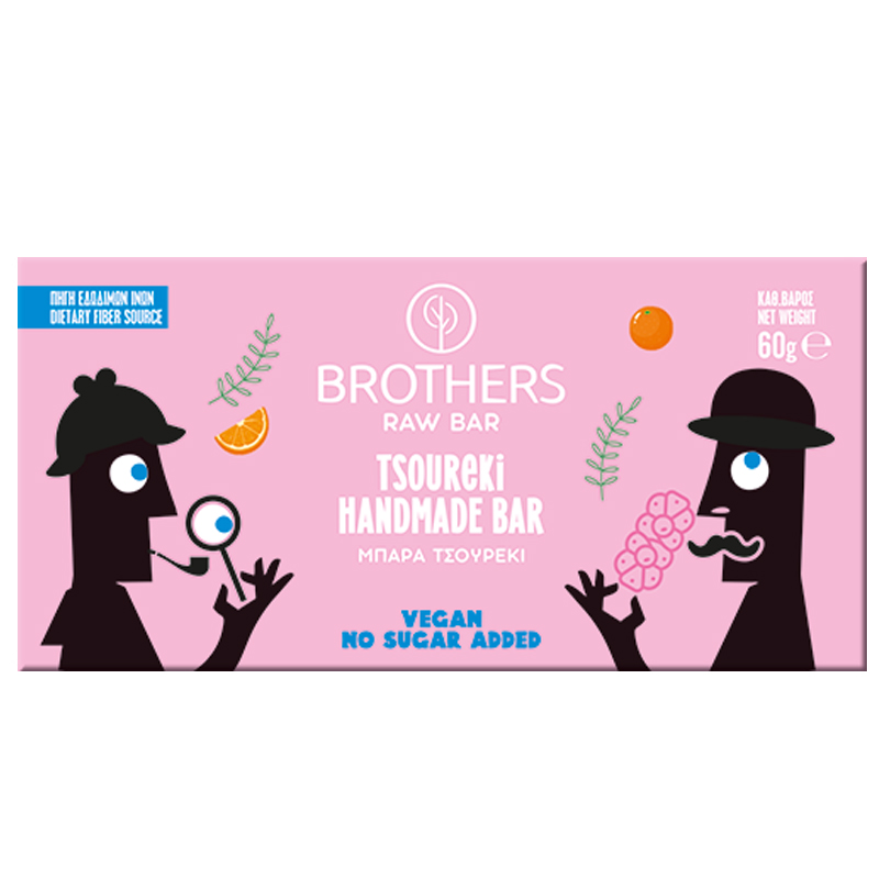 Μπάρα με γεύση Τσουρέκι, αφιέρωμα στο παραδοσιακό γλυκό ψωμί μας. Μοναδική στο είδος της η μπάρα των Brothers θα συναρπάσει μικρούς και μεγάλους. Ωμό σνακ που κρατάει όλα τα θρεπτικά συστατικά των καρπών του. Πλούσιο σε φυτικές ίνες. Vegan, χωρίς γλουτένη,