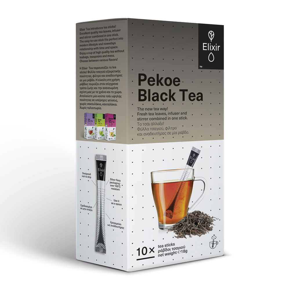 Στα Tea Sticks της Elixir, φύλλα τσαγιού εξαιρετικής ποιότητας, φίλτρο και αναδευτήρας συνδυάζονται σε μία ράβδο. Η εύκολη στη χρήση ράβδος ταιριάζει στο σύγχρονο τρόπο ζωής και στην ανανεωμένη σχέση μας με το χρόνο και το χώρο. Τσάι και ροφήματα υψηλής ποιότητας χωρίς σακουλάκια, χωρίς κουταλάκια, χωρίς ταλαιπωρία!
